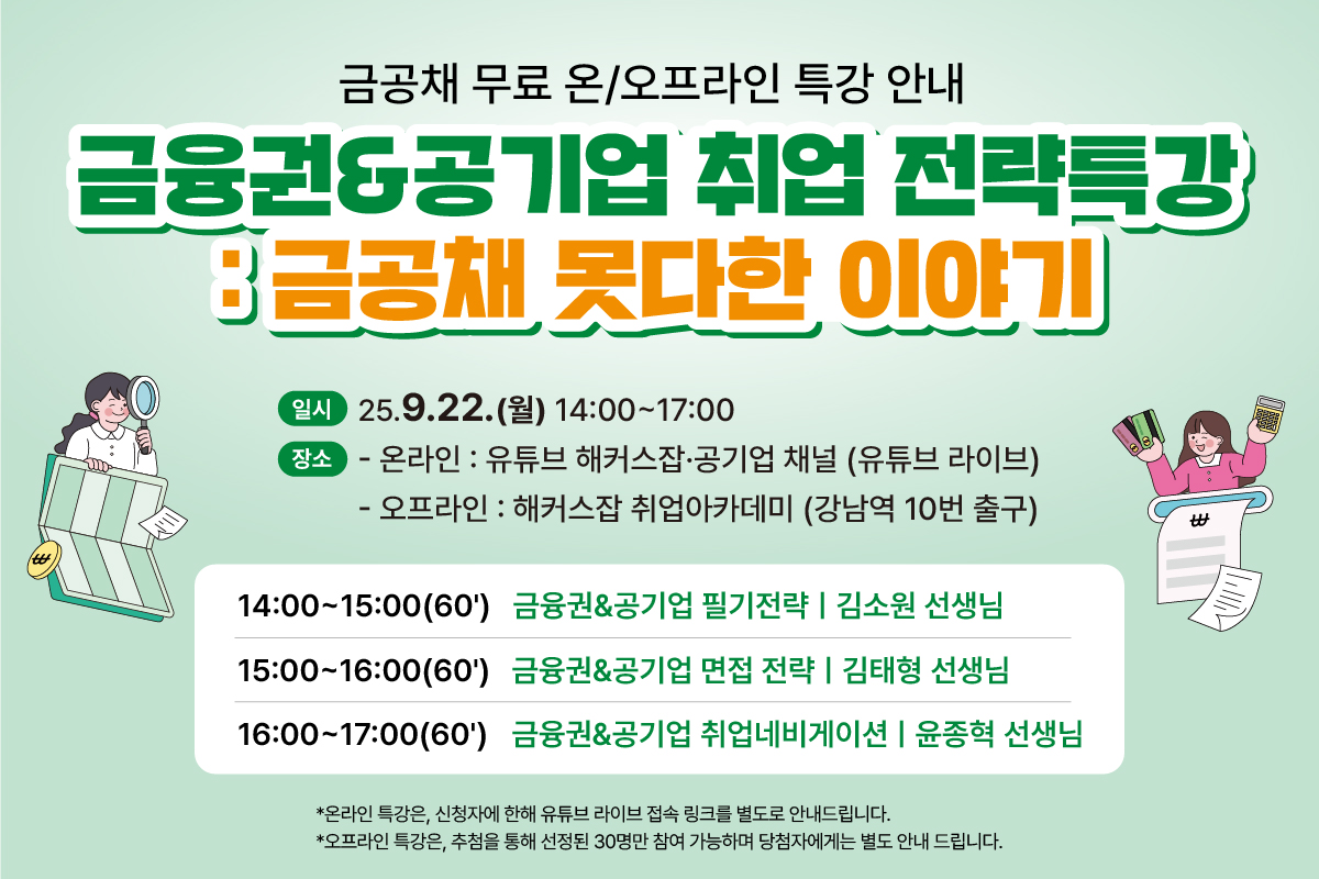 여러분의 성원에 힘입어 금융권&공기업 취업 전략을 주제로 한 금공채 무료 온·오프라인 특강을 마련했습니다.